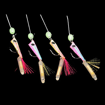 4-Haken Paternostervorfach mit Epoxy-Coated Firestick Kunstköder. Der Gebrauch von verschieden farbigen mini Knicklichtern macht dieses Paternostervorfach noch attraktiver! Durch die holografischen Körper ist dieses Paternostervorfach im Mittelmeer und auch in Norwegen einzusetzen. Das ideale Köderfischvorfach! Natürlich sind die Knicklichter austauschbar. Inklusiv Firesticks.