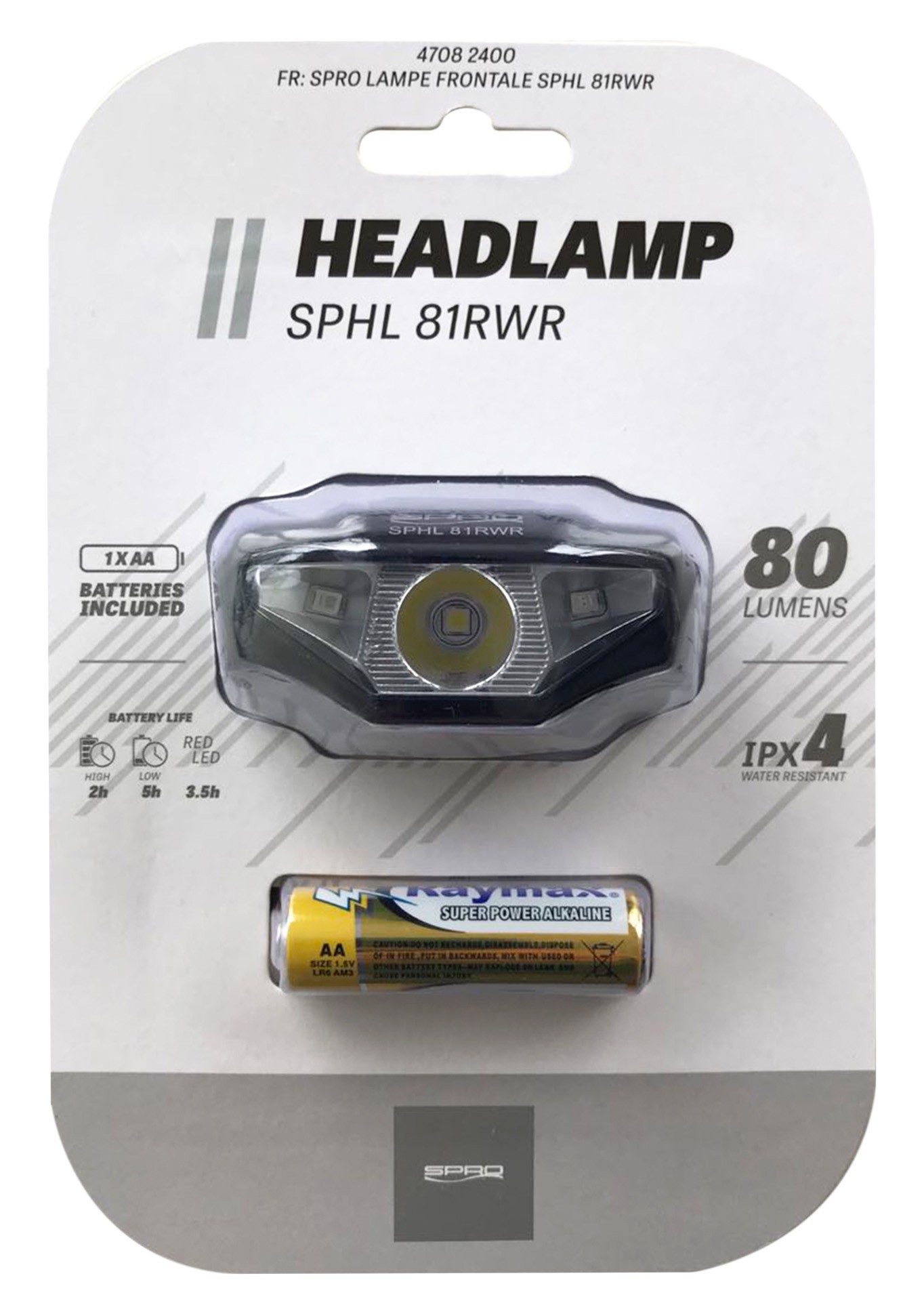 Der SPRO SPHL 81RWR Kopflampe ist aufgrund ihrer IPX4-Wasserbeständigkeit ein wahrer Allrounder. Die Haupt-LED ist eine 1W 80 Lumen-LED und enthält außerdem 2 rote LEDs.