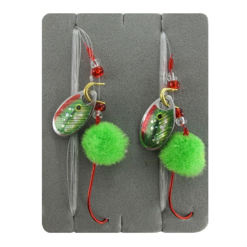 Trout Dope Forellenorfächer mit integriertem Spinnerblatt, grünem Flausch und Perlen, welche die Lock-und Reizwirkung der Forellen erhöhen.